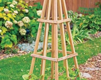 Garden obelisks are tall structures with pyramid tops used as garden decor and plant supports.