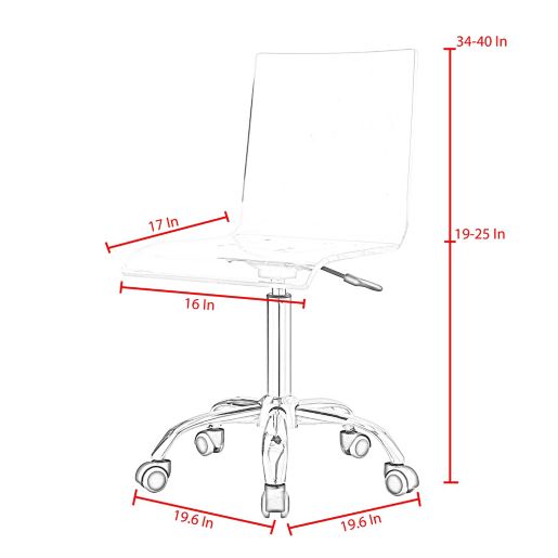 Designed to fit your seat, your back and your work style. Instantly accommodate your guests by bringing out these lightweight plastic chairs. Chrome finish on the metal base of the acrylic office chair caps of the classy and modern look of this collection; 20.52 x 22.01 x 39.49 Clear acrylic chairs make a subtle impression and are the perfect complement to statement tables, desks and counters—the subtlety of lucite allows other furniture to be the focus.
